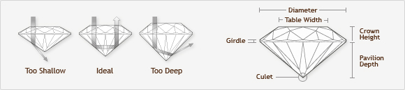 תרשים זה ממחיש עד כמה חיוני ליטוש מושלם משום שהוא מאפשר לאור לחדור דרך הלוח של האבן (החלק השטוח העליון של היהלום) ולהמשיך בשבירת האור החוזר דרך הלוח.