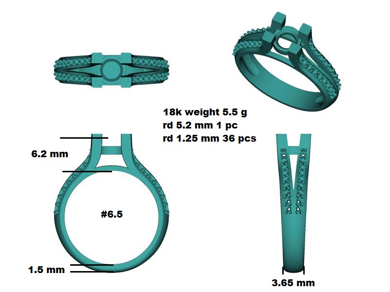 יהלום מרכזי 5.2 ממ4יהלומים בצדדים  36 יהלומים 1.25 ממ