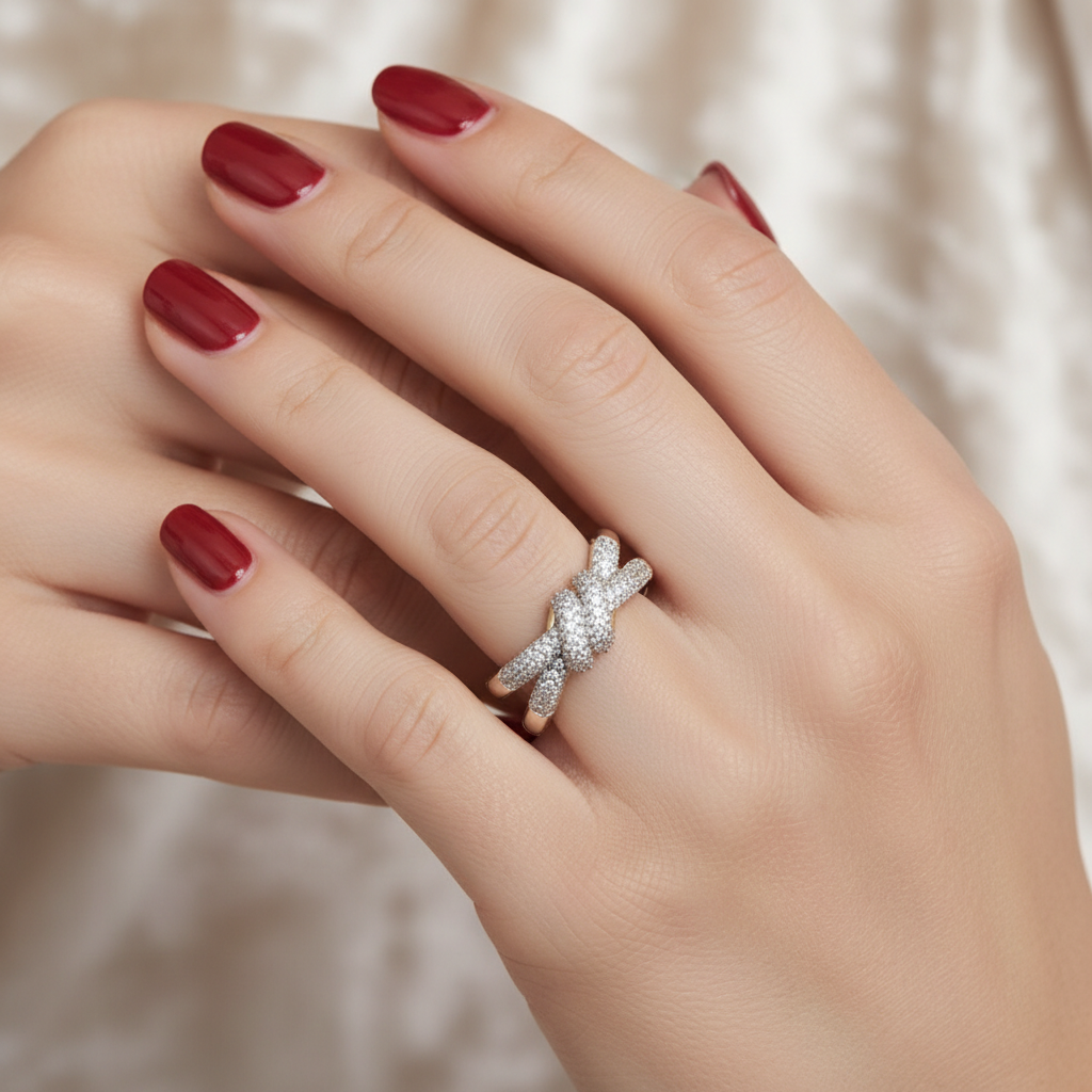 טבעת יהלומים מרשימה בעיצוב יוקרתי, זרוע כפולה משובצת יהלומים נוצצים.